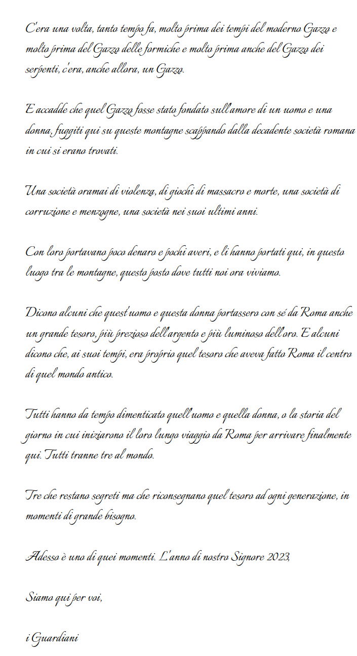 Non è tanto una caccia al tesoro quanto una caccia al racconto, una piccola avventura in cui risolviamo enigmi e troviamo indizi, per una storia su Gazzo e su come Gazzo è arrivato qui in valle D'Arroscia. La nostra storia inizia quasi 2000 anni fa quando due persone lasciano Roma.